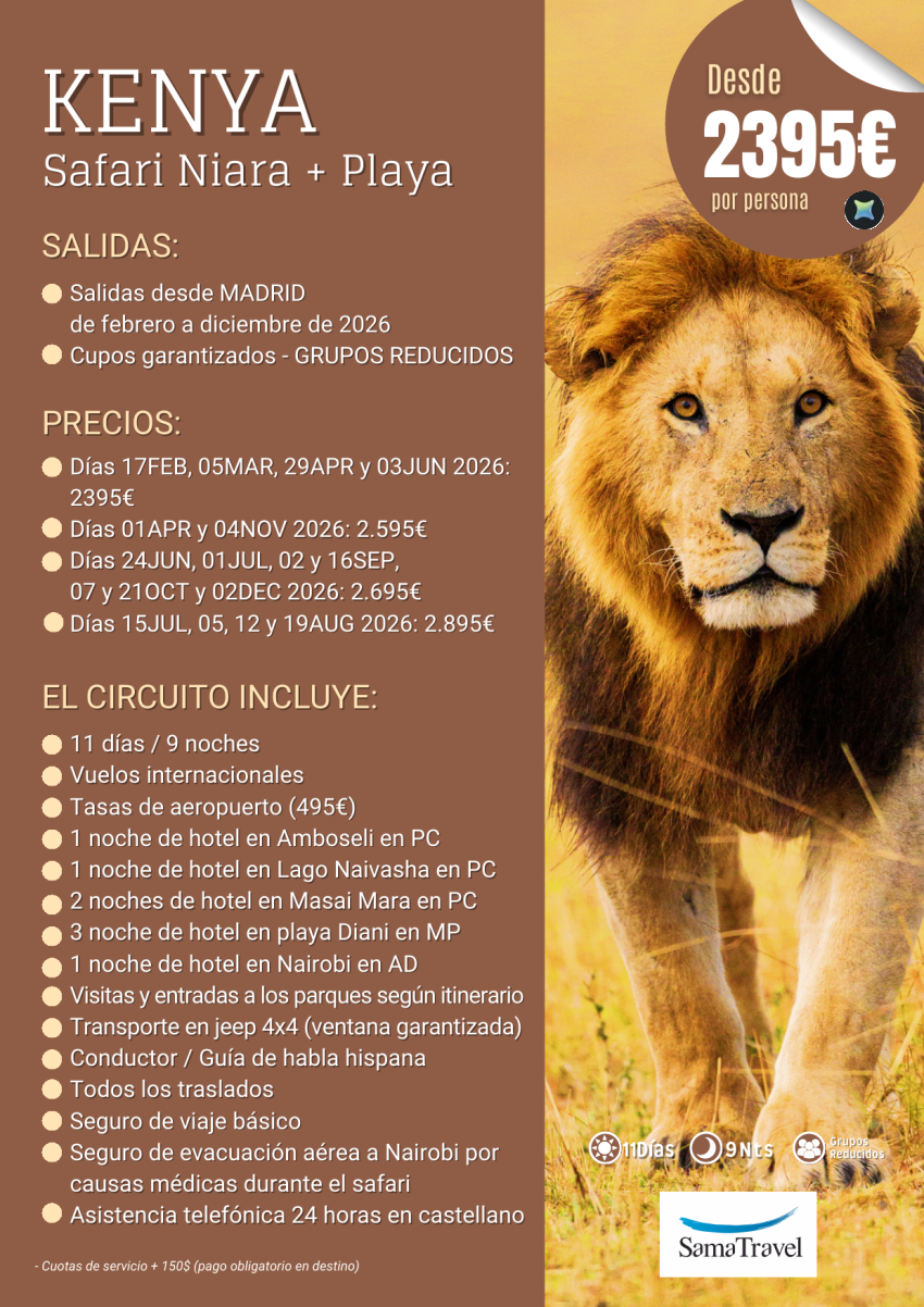 KENYA "Safari Niara+Playa": 11 días con Amboseli, Lago Naivasha, Masai Mara, playa Diani, Nairobi, *dsd 2395€*